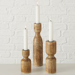 Die Kerzenhalter sind aus Mango-Holz gefertigt, die Oberfläche ist geschliffen und gewachst. In 3 verschiedenen Ausführungen.