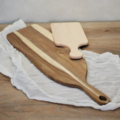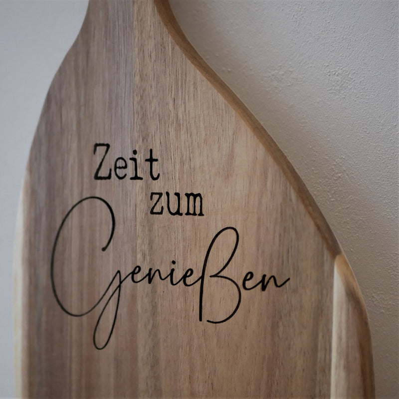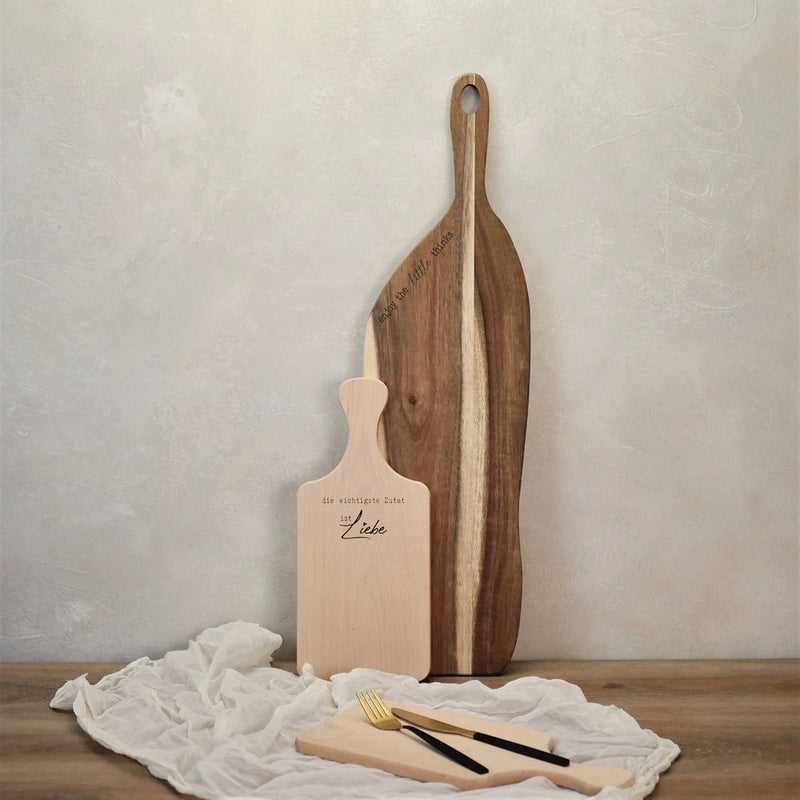 Schneidebrett mit Griff aus massivem unbehandeltem Akazienholz, einem natürlichen und organischen Material, das durch seine einzigartige Farb- und Maserungsvielfalt besticht. Bitte beachtet, dass natürliche Holzmerkmale wie Äste, kleine Risse und Maßabweichungen auftreten können. Diese Besonderheiten sind Teil des Charakters des Holzes. Durch die Lasergravur und wachstumsbedingte Unregelmäßigkeiten, kann es zu kleinen Farbdifferenzen kommen. Dies stellt kein Reklamationsgrund dar.