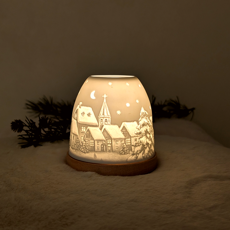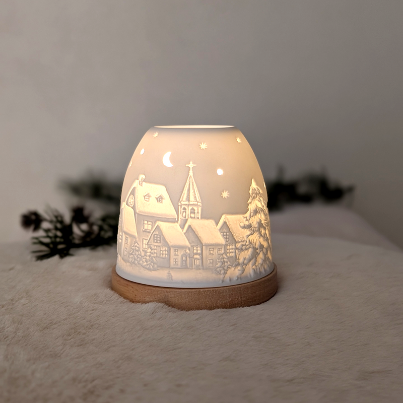 Porzellan-Windlicht " Winterdorf" – Magische Lithophanie mit Holzsockel