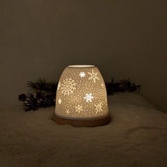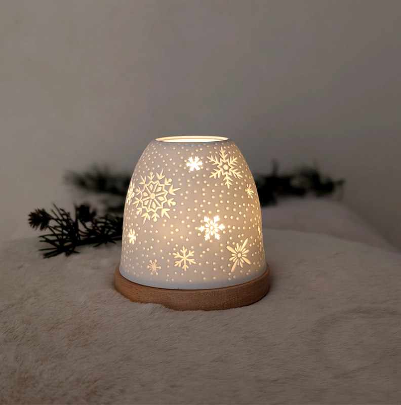 Porzellan-Windlicht "Schneeflocken" – Magische Lithophanie mit Holzsockel