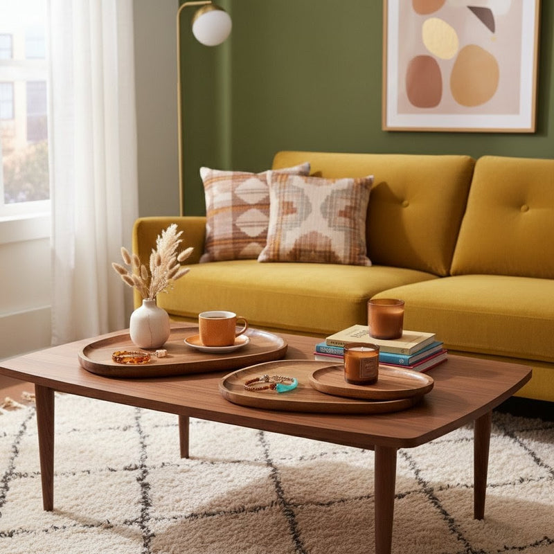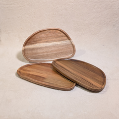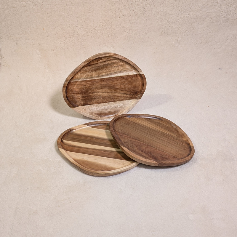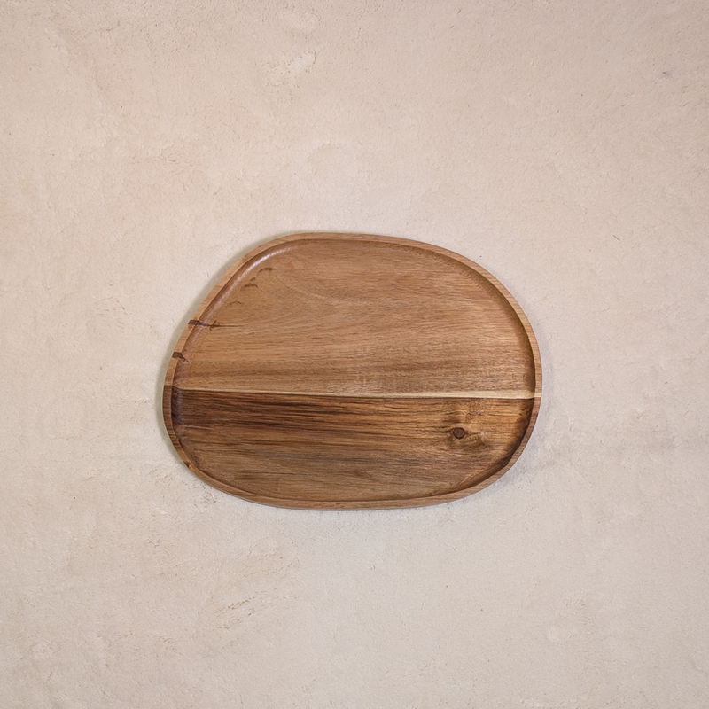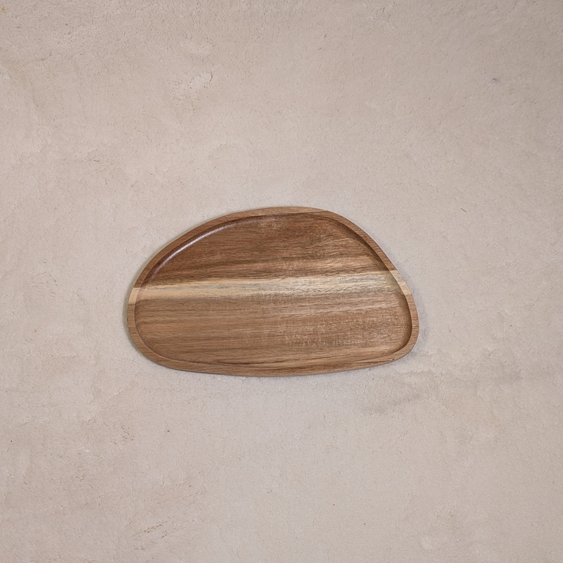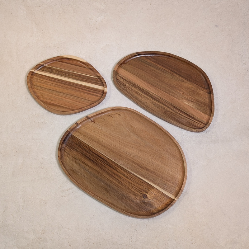 Diese Tabletts aus massivem Akazienholz vereinen zeitlose Eleganz mit organischem Mid-Century Design. Die sanft geschwungenen Formen und die individuelle Maserung machen jedes Tablett zu einem Unikat. Ideal als Dekotablett, Schmuckablage oder stilvolles Tablett für Tee und Kaffee und passend für moderne, skandinavische, boho und retro Wohnstile.